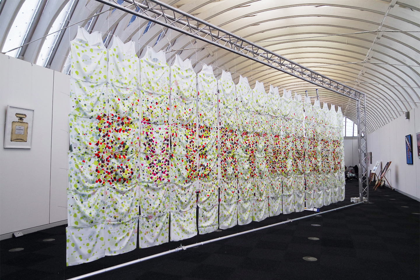 Seen alone or at close range, the dots appeared to be abstract decoration. Viewed as a piece, however, they revealed a message: the front spelled ‘EVERYWHERE’ and the back ‘NOWHERE’. As visitors purchased the tops, the message disappeared.